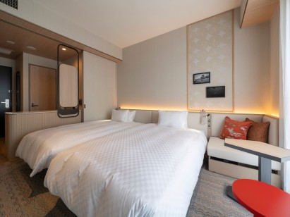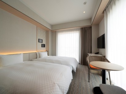 2面の大きな窓が開放的なワンランク上のツインルームです。浴槽付きのバスルームで広々とご利用いただけます。