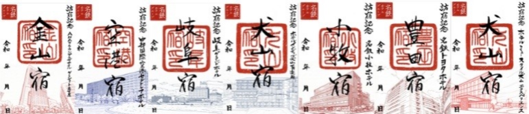 甲冑の巡回に合わせて、各ホテルではオリジナルデザインの「御宿場印」を販売いたします。かつて旅人が宿場町で証を残したように、各ホテルを「現代の宿場」に見立て、個性豊かな7種のデザインをご用意しました。